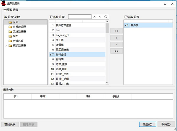 5.按【来源数据】,弹出如下的“选择数据表”窗口。所谓“数据源”指的是现有模板上那些已创建的数据表。因为我们输入的所有信息都存储在这些数据表中。窗口左上部的列表中列出了所有已创建的数据表的名称。在左侧列表中选中“客户表”,点击【>】,客户表移到右侧列表,按【确定】