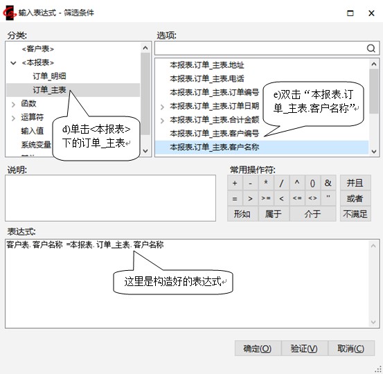 构造好的表达式为“客户表.客户名称=本报表.订单_主表.客户名称”,如下图