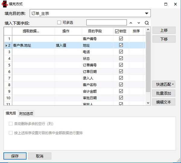 9.点击【填充方式】,出现“定义填充方式”窗口,填充数据表选择“订单_主表”,点击“地址”所在行的第一列编辑图标。