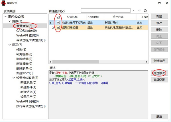 下面我们以出库单为例看一下如何批量修改提数公式的设置属性(回写公式的批量修改操作参考提数公式)。