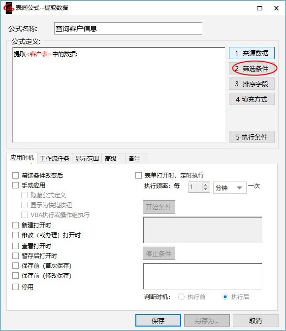 4.弹出“表间公式-提取数据”窗口,在公式名称处输入“查询客户信息”,应用方式选择“筛选条件改变后”,如下图。