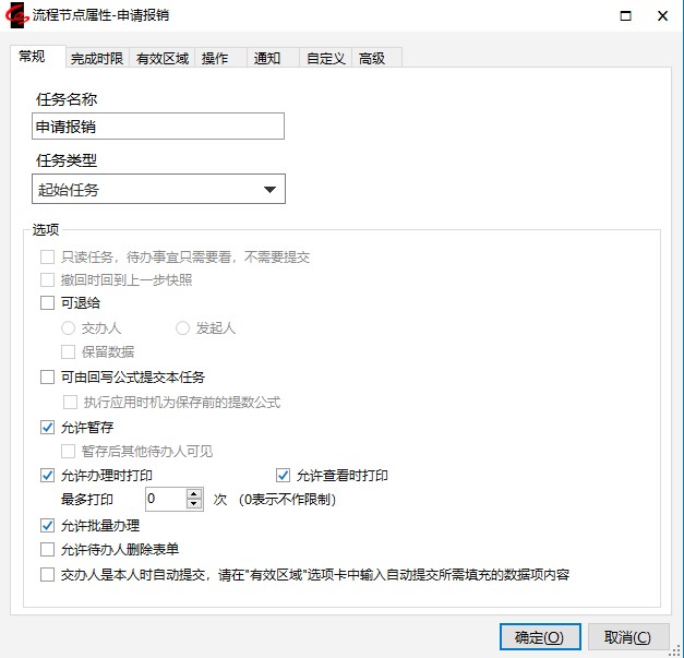 2.在“常规”标签页输入任务名称“申请报销”,在任务类型中选择“起始任务”(默认的即“起始任务”)。如下图: